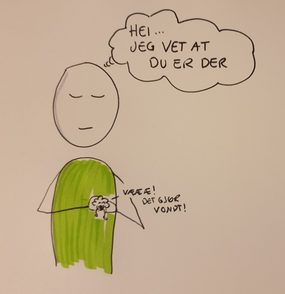 Du kan jo teste det ut, dette som jeg sier. Når det er noe vanskelig du kjenner på. Ta et øyeblikk for deg selv. Kanskje sitt litt godt, bli oppmerksom på rommet du sitter i og finn deg til rette før du vender oppmerksomheten innover. Deretter kan du se om du kan oppdage et «indre noe», samtidig som du merker at du er du og det er det. Så kan du se om det går an å møte «det der» med vennlighet og åpen nysgjerrighet, og la «det» beskrive seg selv for deg og se hva som skjer.