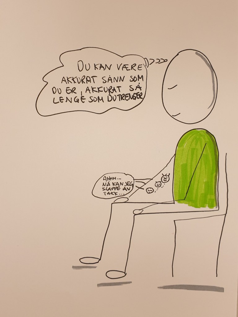 - et «rom» hvor det ikke finnes dømming, men åpen, rolig og ikke-dømmende, ikke-påtrengende lytting hvor det kjennes som man har all tid i verden (og dette rommet kan tilbys av deg selv til deg selv, eller til deg fra en venn, bekjent, veileder, terapeut etc.)