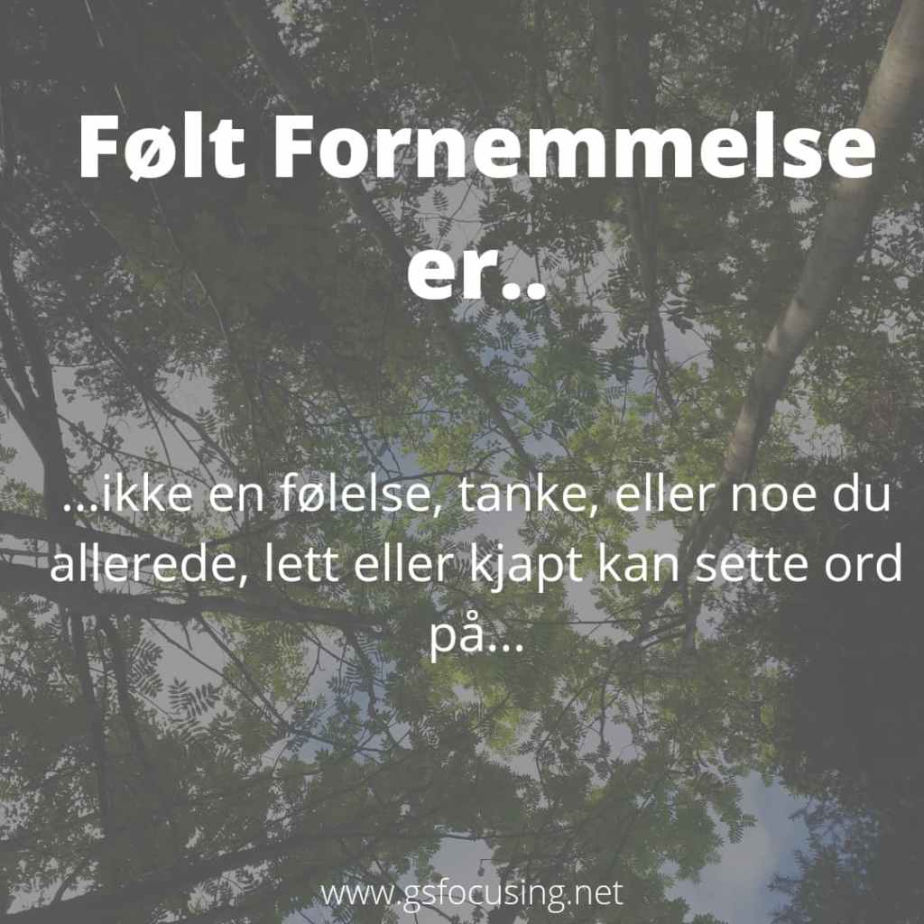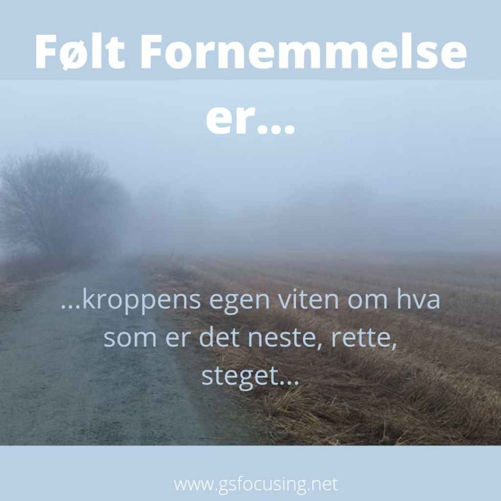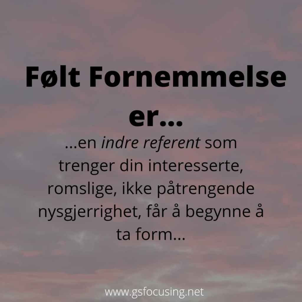 Følt Fornemmelse er vag, grumset, uklar, først ordløs og navnløs, og allikevel helt tydelig følt, på en kroppslig måte, hvis vi inviterer den til å forme seg. Den forsvinner så fort vi dømmer, analyserer eller forsøker å gjøre den logisk for tidlig. Hvis vi tar et øyeblikk til å sitte ved siden av den, sammen med den, med åpen, aktiv, ikke-invaderende, ikke-dømmende nysgjerrighet, vil den kunne åpne seg og komme mer tydelig, med overraskende og dypt følt mening.